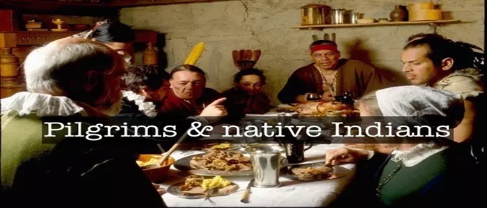 The pilgrims hosted a big feast to thank the Indians for teaching them how to grow food and having a harvest: 清教徒举办了一场盛宴,感激印第安人教他们种植、得到了丰收